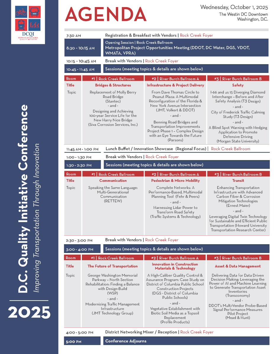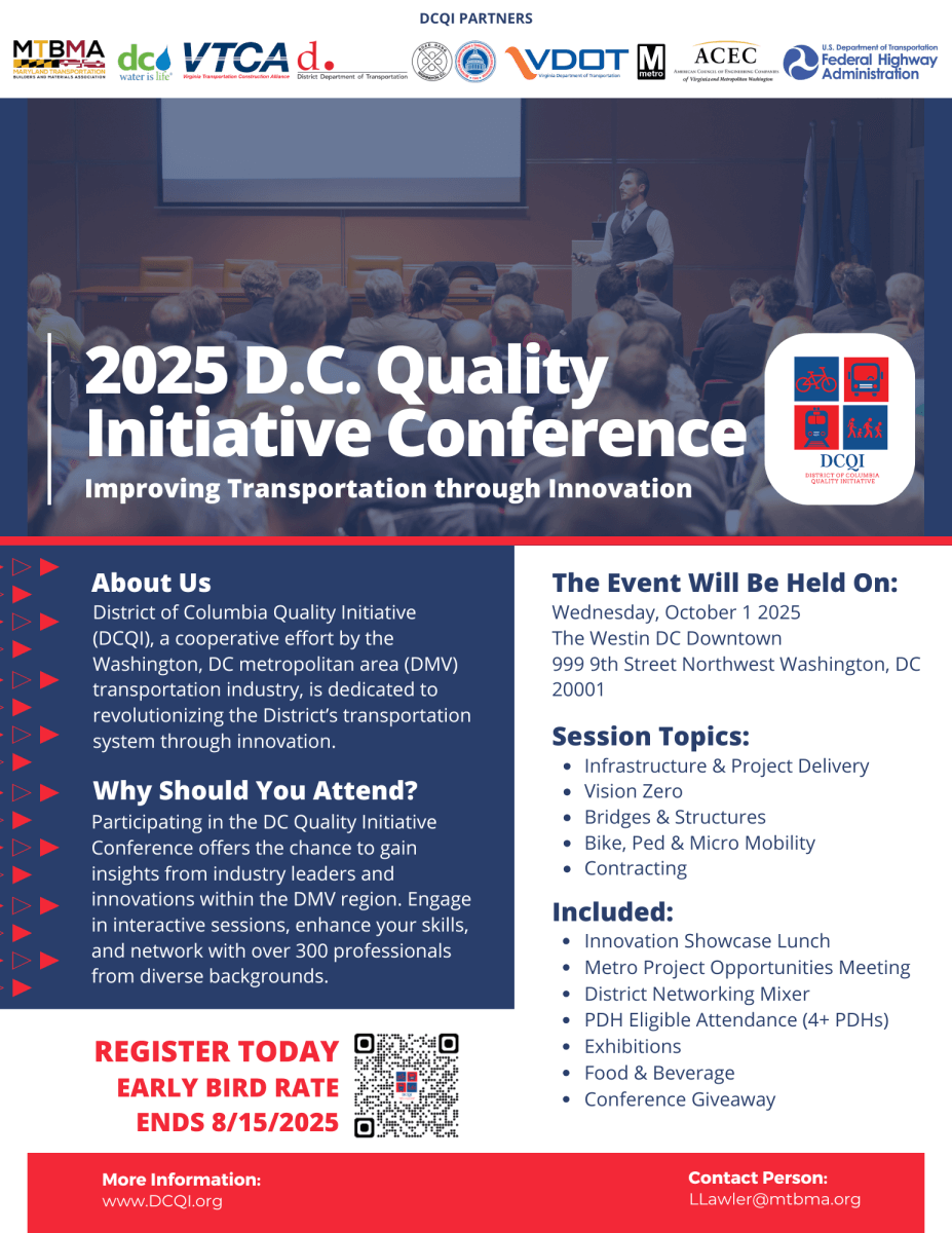 DCQI showcases the latest advancements in construction materials and technology, electric vehicles, autonomous operations, smart infrastructure, mobility-as-a-service, and other disruptive solutions. Attendees gain exclusive insights into the future of DC transportation and the transformative impact it will have on our local community.